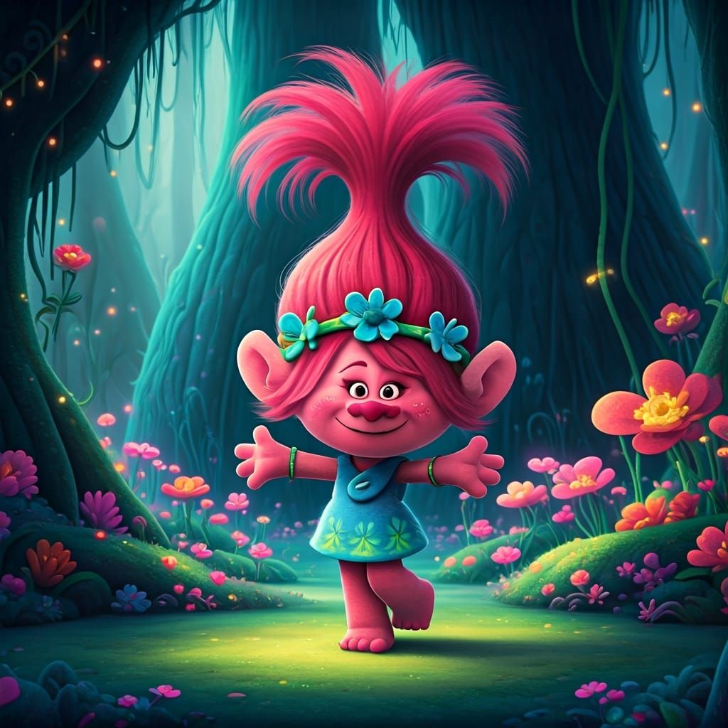 This image shows colorful trolls dancing and singing in a vibrant forest filled with flowers and trees. The scene is rendered in a playful, pop art style with futuristic and whimsical elements.