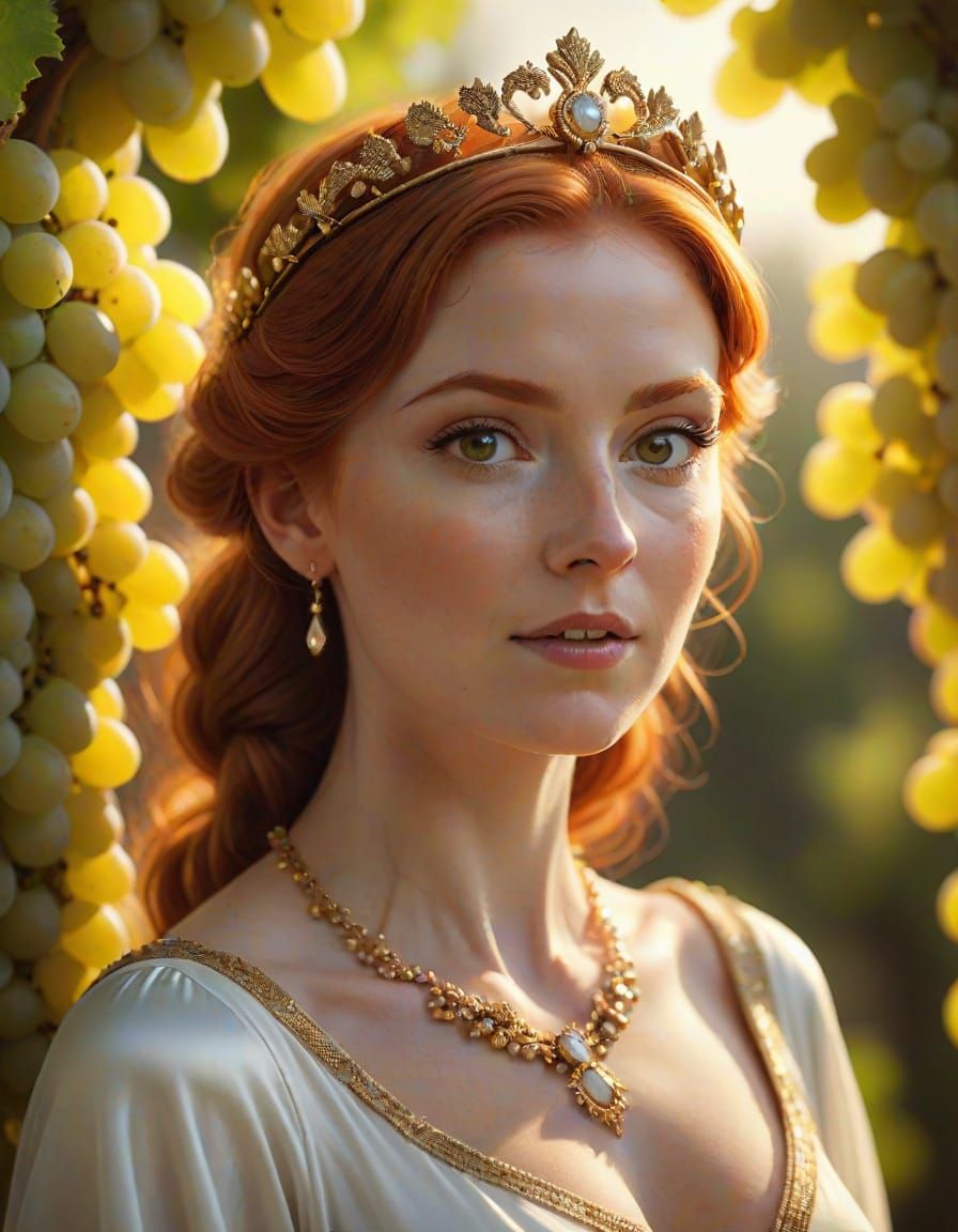 A striking picture of an owl with a redheaded woman's face, adorned with a golden tiara and necklace. She wears a white silk tunic and hides behind ripe grapes, bathed in golden hour light with a bokeh effect.