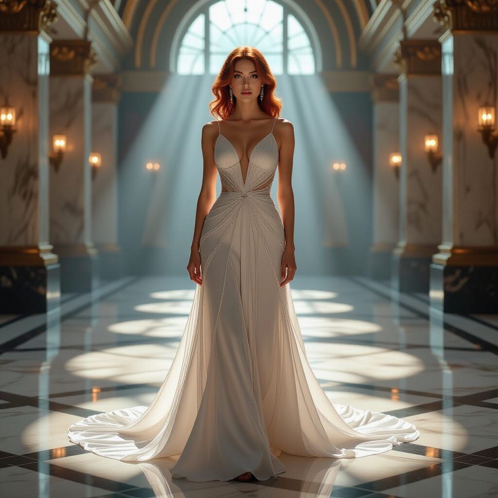 A captivating image of a woman with auburn hair in a fiber optic gown. Art deco ballroom setting with ethereal lighting, reminiscent of organic curves and hyperrealism, in vibrant colors.