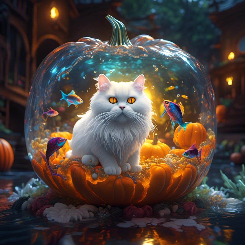 A hyperrealistic image of a guppy swimming inside a glass pumpkin. A white cat with yellow eyes looks through the pumpkin. The image is a detailed matte painting with deep color and intricate detail.