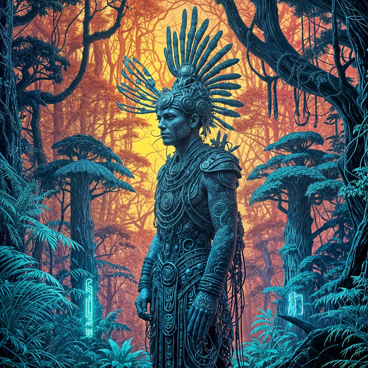 A striking picture of a biomechanical shaman in a digital rainforest. The shaman, with glowing tribal tattoos, performs a ritual in a surreal, psychedelic style reminiscent of Moebius.