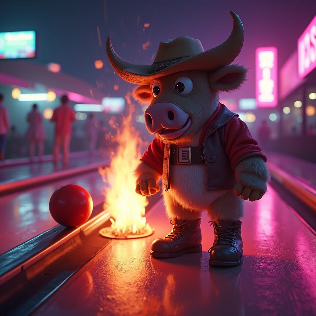 A neon-lit dystopian bowling alley is lit by a bonfire, with a cow wearing a cowboy hat and bowling shoes as a mascot. This digital artwork has a vibrant, cinematic aesthetic.