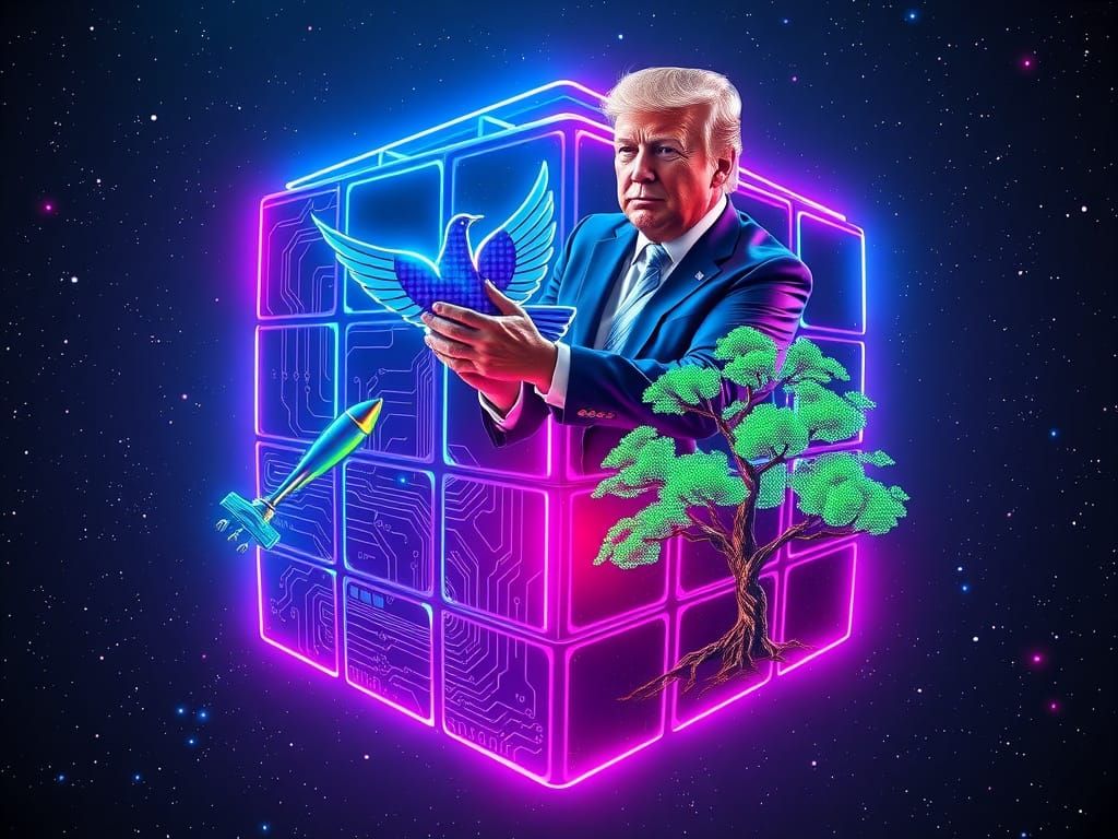 This image shows a mesmerizing, neon-lit Rubik's Cube suspended in a star-studded cosmic expanse, radiating an ethereal glow with vibrant circuitry lines. The scene features futuristic characters in metallic and futuristic SpaceX suits, surrounded by neural networks and pixelated elements, evoking a sens...
