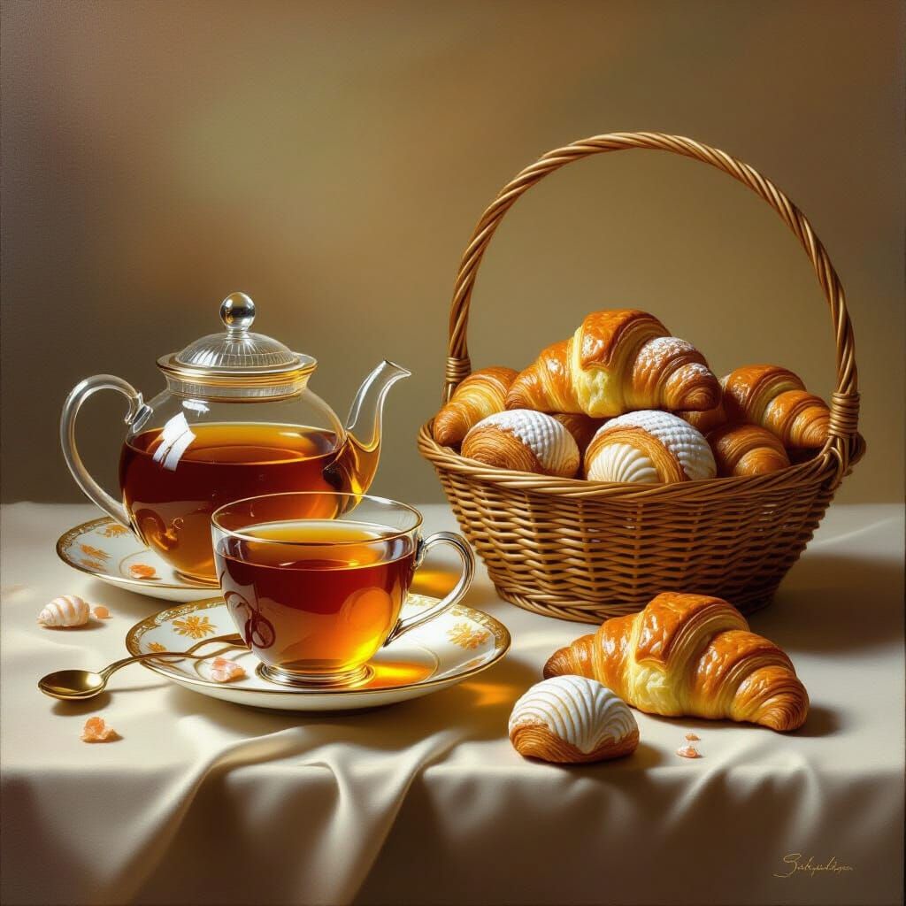 This image shows a golden plateau with tea, a teapot, and a metallic basket of croissants and madeleines. Rendered in a classical oil painting style with soft lighting.