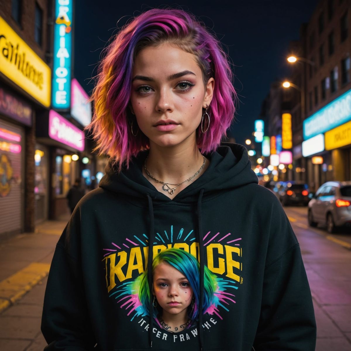 This image shows a young woman with a bold, colorful hairstyle and tattoos, set against a vibrant urban backdrop with neon signs and nighttime atmosphere.