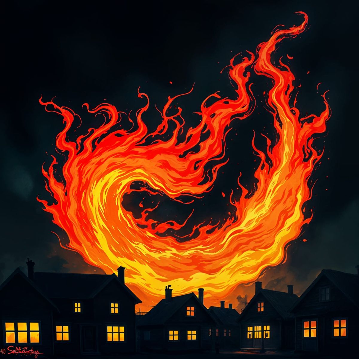 A vibrant, high-contrast image of a serpent-like creature made of flames flying across a dark night sky, leaving a fiery trail, with traditional Ukrainian houses visible as silhouettes below, set against a backdrop of intense oranges and reds contrasting with deep blacks and blues.