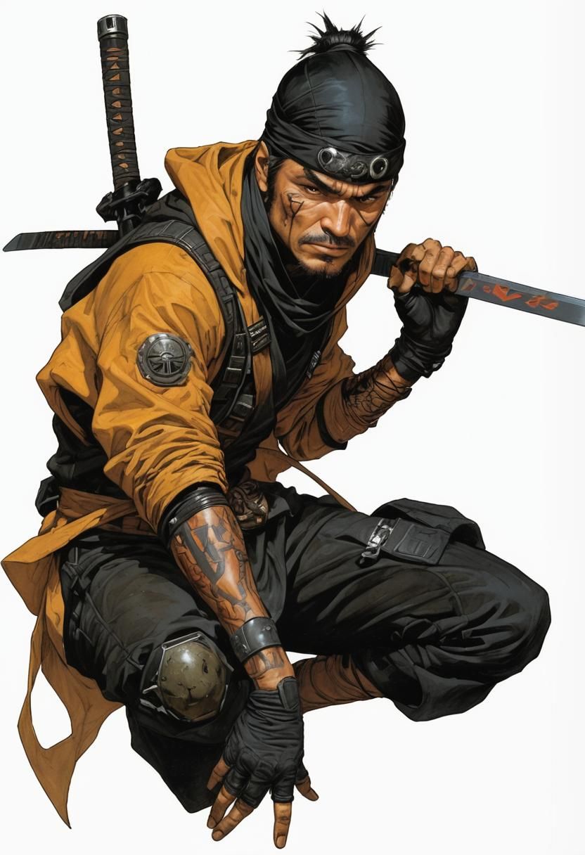 A striking picture of a futuristic ninja warrior. The full color illustration features vivid hues and bold black outlines against a stark white backdrop, in a style reminiscent of classic fantasy art.