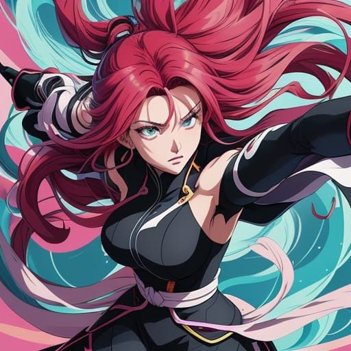 This image showcases a young woman with flowing hair on a rooftop, rendered in a dynamic manga style with vibrant cel-shading and bold outlines. High detail and a dramatic color palette create an anime wallpaper aesthetic.