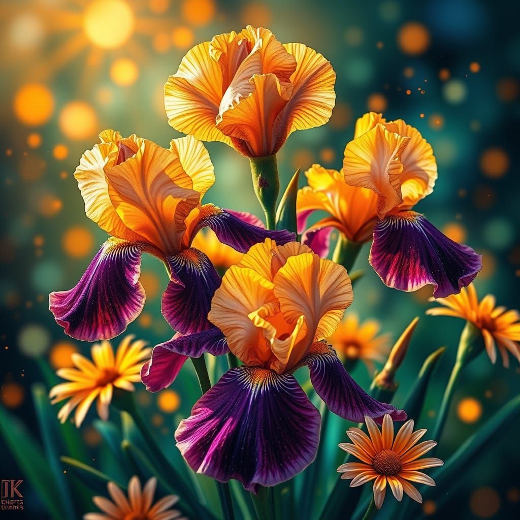 A striking picture of vibrant irises and daisies glistening with dew. The floral arrangement is set against a dark bokeh background with glowing fog, orange sparkles, and green mist in an abstract impasto style.