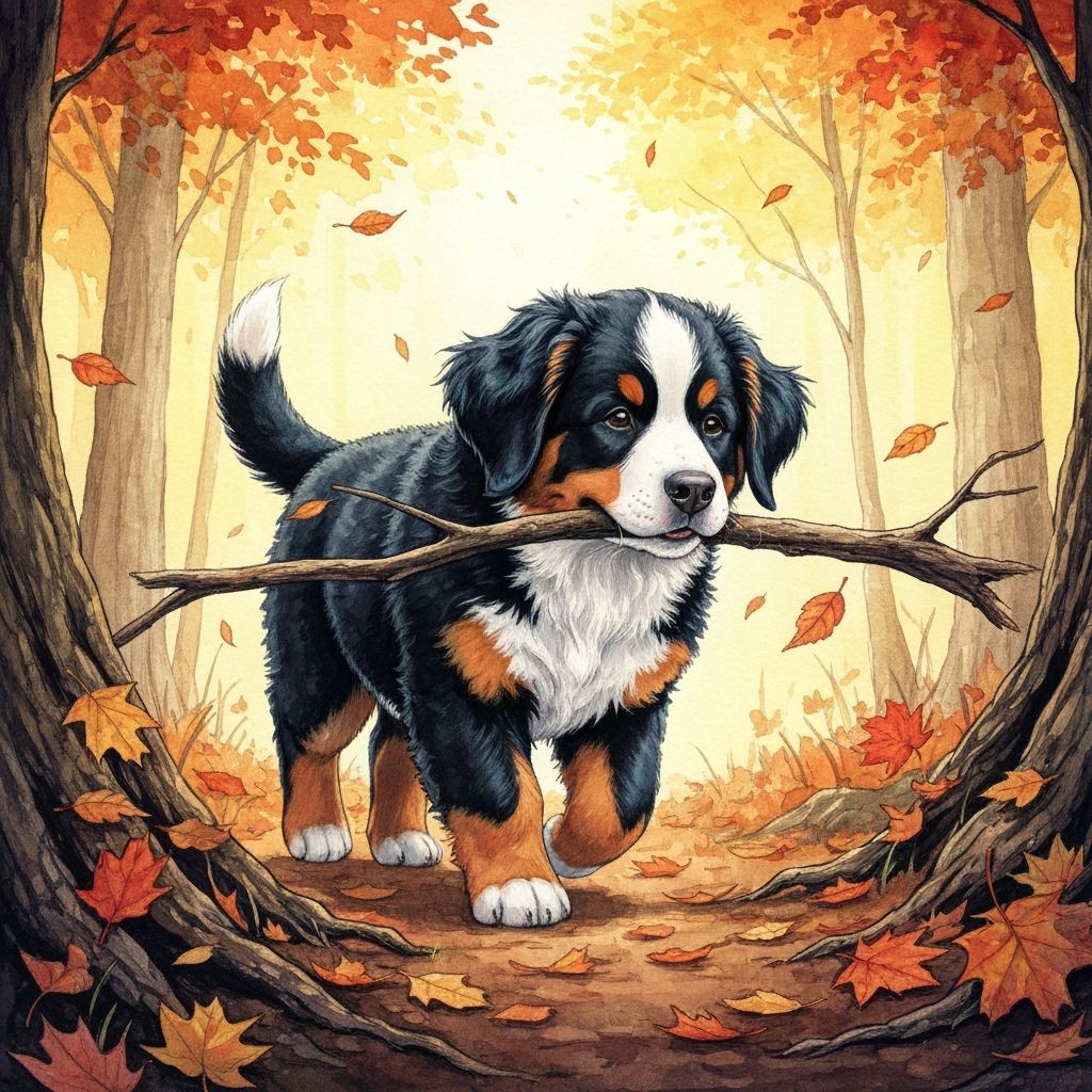 This image shows a cute, fluffy Bernese Mountain Dog puppy walking through a colorful autumn forest. It features vibrant watercolor textures and dappled sunlight, rendered in a comic book art style.