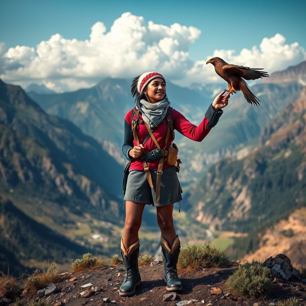This image depicts a young Indian woman standing in a breathtaking mountain valley, pointing at an eagle with a raised hand, amidst a serene and idyllic setting with majestic white clouds and vibrant colors, reminiscent of Ansel Adams' and Steve McCurry's iconic styles.