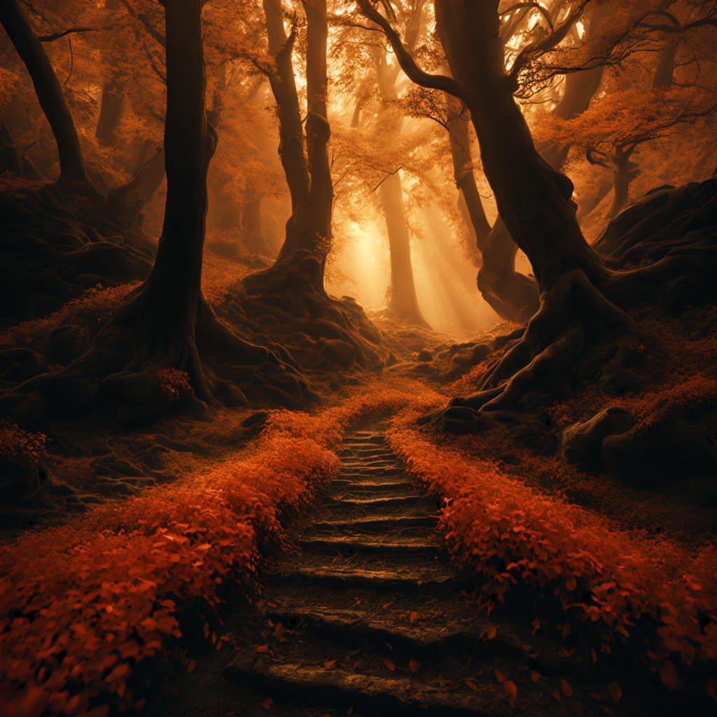 A stunning digital matte painting of a small squirrel emerging from a pile of vibrant orange, gold, and red autumn leaves. Captured in a cinematic film still style with atmospheric lighting.