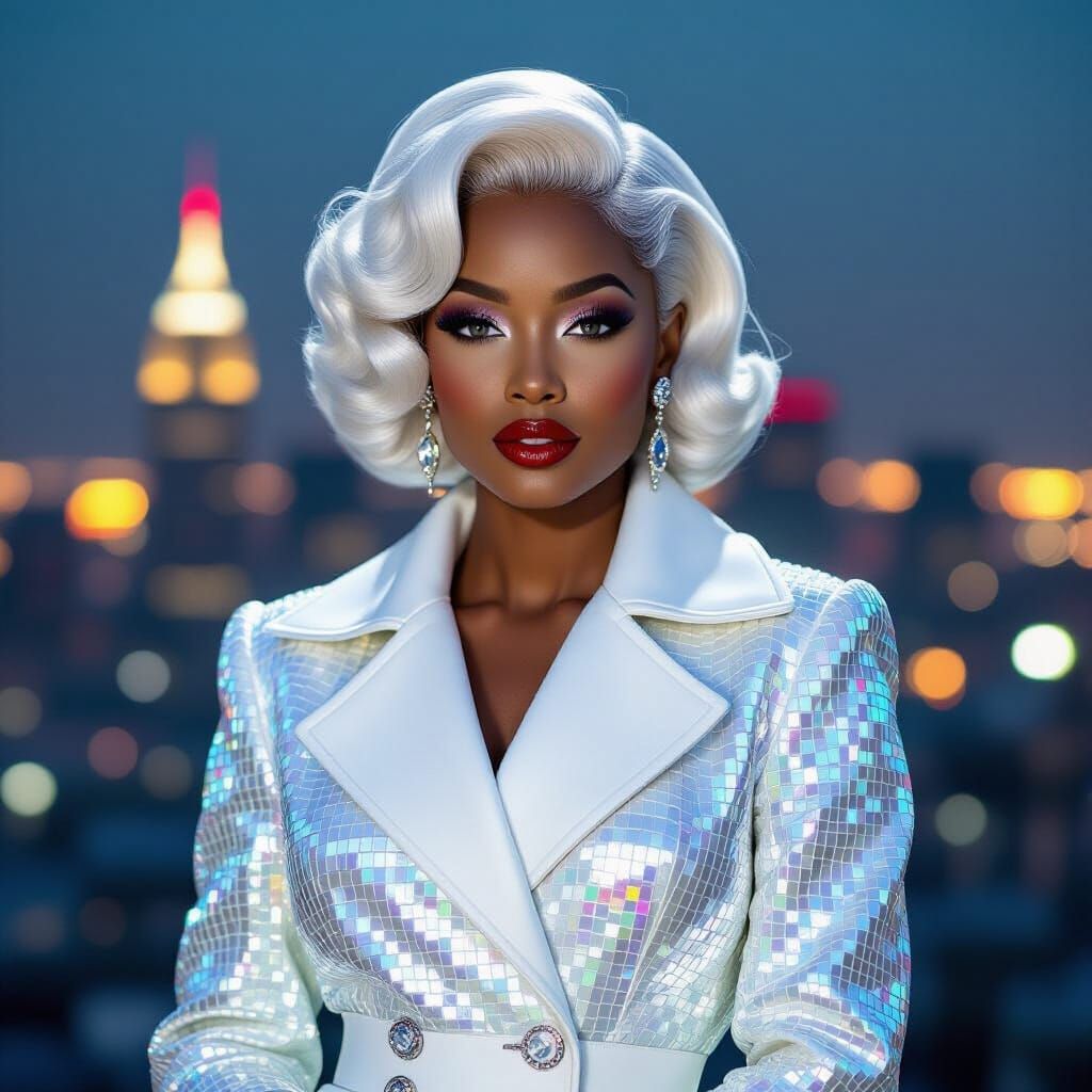 A photograph of a striking African American woman with captivating eyes, showcasing an elegant, curly 1950’s pinup bob hairstyle dyed a brilliant white. She is confidently posed, wearing a futuristic iridescent coat crafted from crushed glossy mirrored glass, adorned with shimmering moonstone gemstones ...