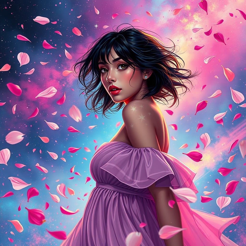 This image shows a beautiful woman posing in a flowing dress amidst a whirlwind of colorful, floating petals, set against a vibrant, galaxy-inspired fantasy sky. The scene blends gritty textures with whimsical, wet oil-like effects, creating a surreal, chaotic atmosphere with neon lights, digital glitche...