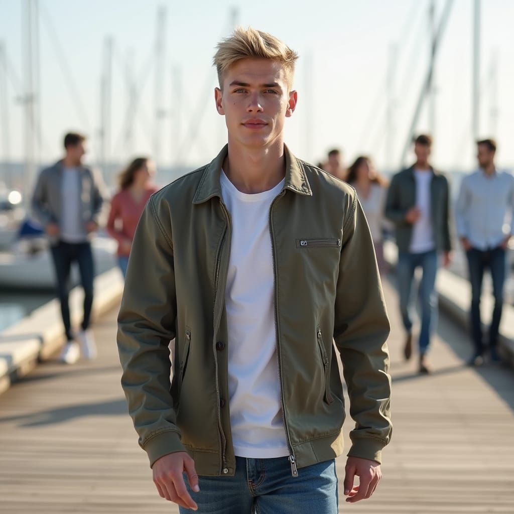 This image shows a lean, athletic 25-year-old American man with blond hair wearing a spring jacket, tee, and jeans. He stands on a boardwalk with a marina visible in the distance during the afternoon.