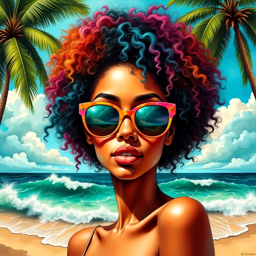 This image shows a close-up of a beautiful woman with curly hair and fun sunglasses, set against a vibrant beach scene with crashing waves and palm trees