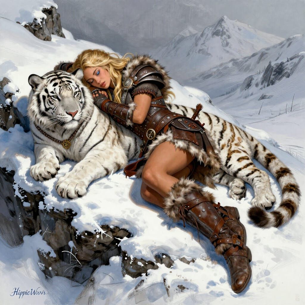 This image shows a strong barbarian warrior girl and her snow tiger companion resting on a snowy mountain ledge. Rendered in a dark romance fantasy style with dramatic lighting.