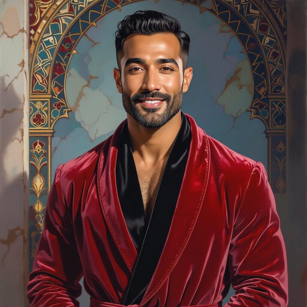 A hyperdetailed portrait of a proud, smiling man in velvet bathrobes, showcasing Art Nouveau and alcohol ink aesthetics with dynamic lighting and splash art elements.