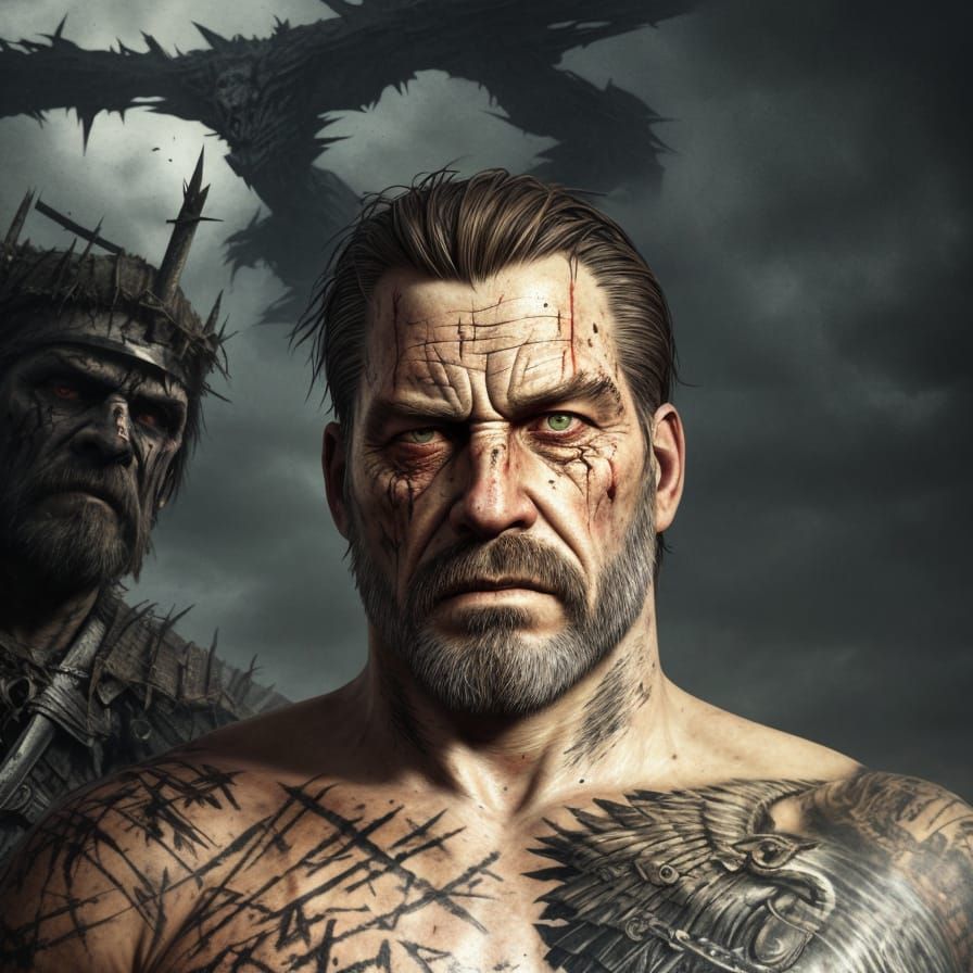 A striking concept art portrait of a lone, strong warrior with a weathered face and intense eyes, depicted with dramatic chiaroscuro lighting and a powerful aura in a grim, atmospheric style.