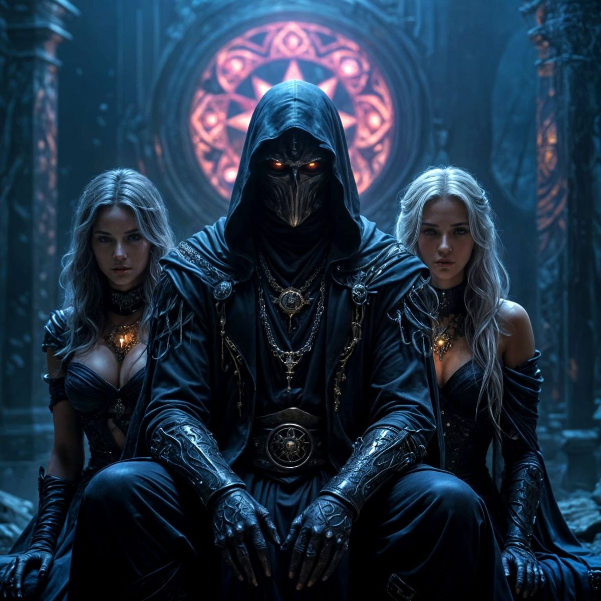 dark cloaked sorcerer with his 2 gorgeous followers