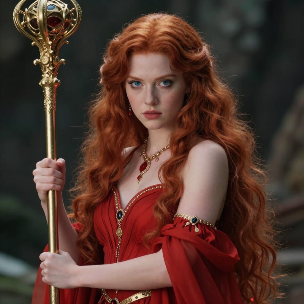A striking image of a powerful goddess with long red hair and blue eyes, wearing a red dress and holding a golden scepter. Presented as a cinematic film still with dramatic lighting and rich colors.
