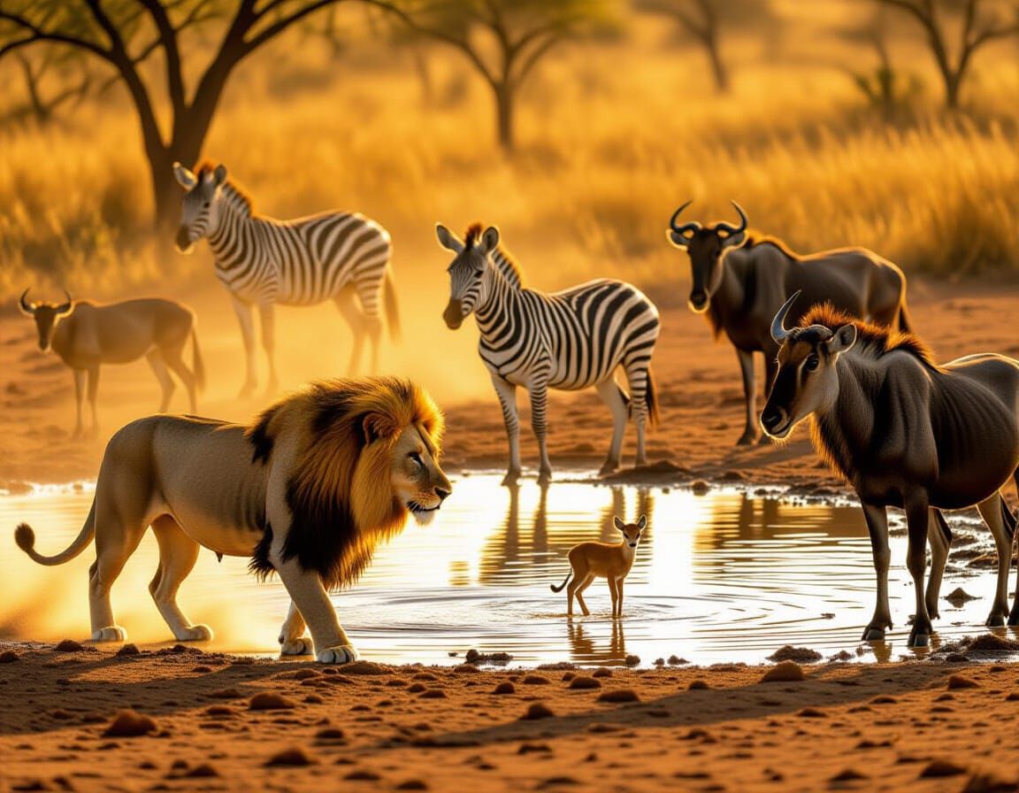 A realistic wildlife photojournalism image capturing a lion stalking various animals at a dusty African watering hole during golden hour. The scene emphasizes dramatic tension and raw nature.