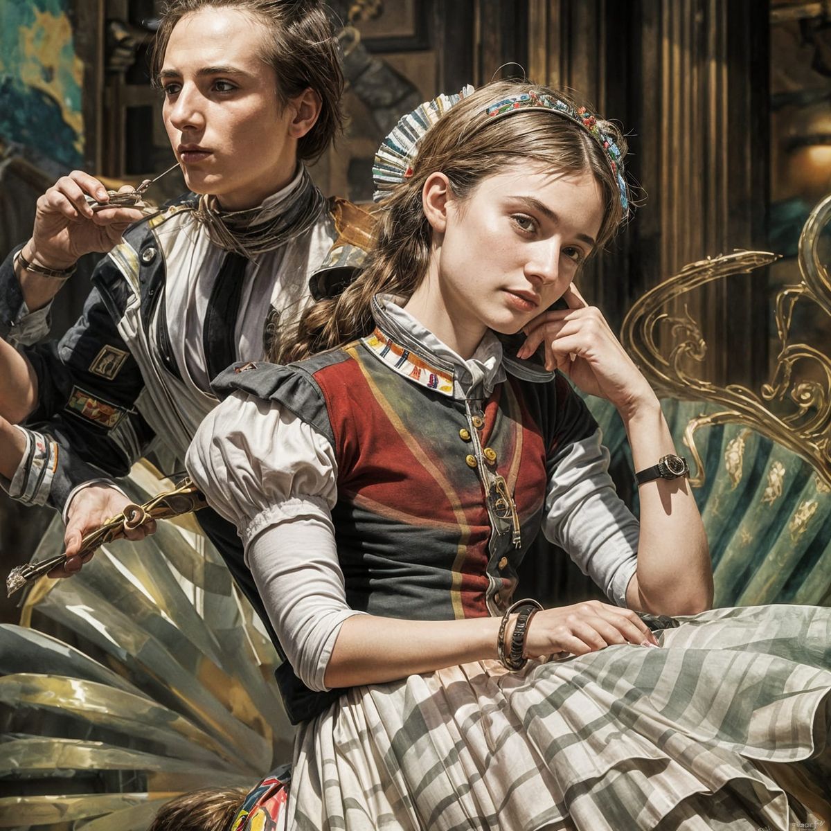 This image shows a surreal scene of a guard with hands cuffed, interrupting his companion, set in a warm and dreamlike atmosphere with watercolor-like brushstrokes and vibrant colors, evoking a sense of growing and waning rhythm