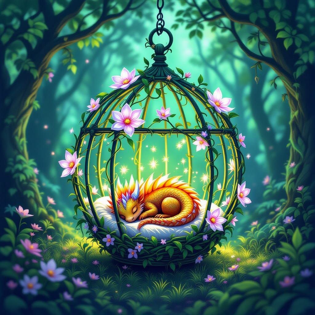 This image shows a glowing, fantasy birdcage made of vines and crystals, floating in a magical forest. A small dragon sleeps inside, depicted with vibrant colors and intricate detail in a whimsical illustration style.