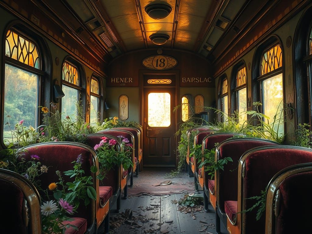 This enchanting scene depicts an abandoned train car reclaimed by wildflowers and lush greenery, bathed in soft, ethereal light through stained glass windows, reminiscent of Impressionist and Naive art styles.