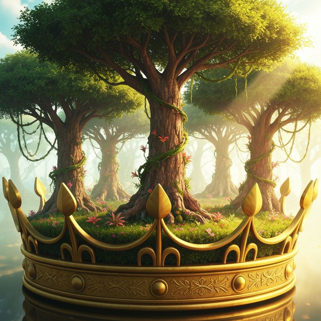 A vibrant forest thrives within an ornate king's crown. Sunlight filters through the canopy, illuminating the detailed bark, vines, and petals. The picture blends royal imagery with a fantastical forest in a whimsical style.