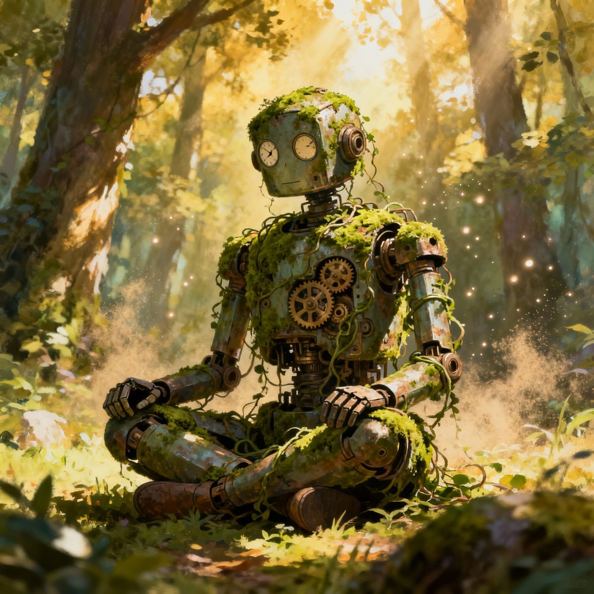 This image depicts an ancient, moss-covered automaton with detailed clockwork in a serene forest. Rendered with textured concept art and impressionistic painterly strokes, it evokes a sense of forgotten technology.