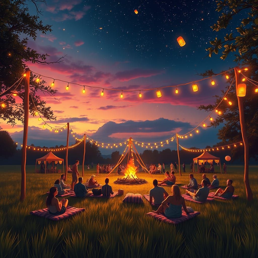 A vibrant summer music festival unfolds in a wide open meadow, filled with glowing fairy lights strung between wooden poles and tree branches. A warm bonfire crackles at the center, casting golden light on a circle of relaxed festival-goers lounging on blankets and low cushions. The sky above fades from ...