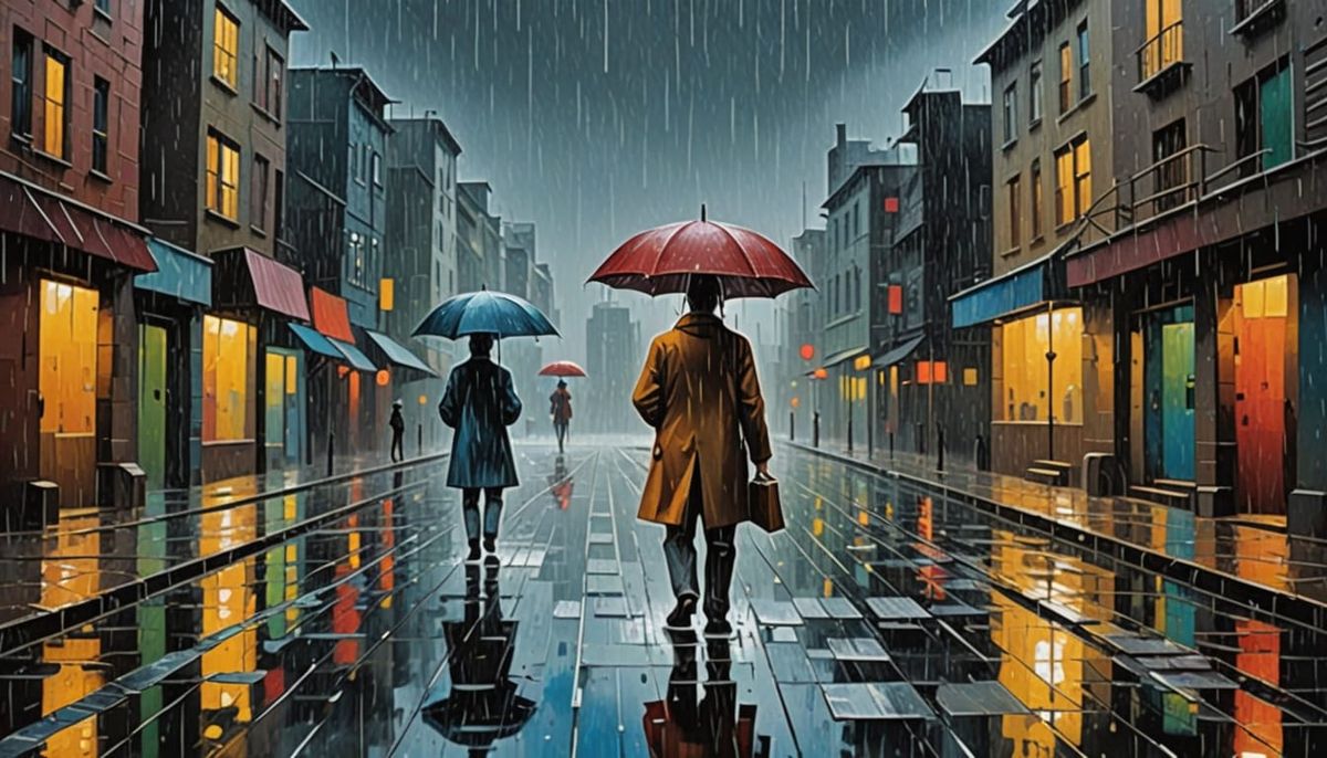 Abstract semi-figurative art in the style of Klee, Miro, and Kandinsky depicting a dramatic cinematic wet rainy scene with drizzling rain.