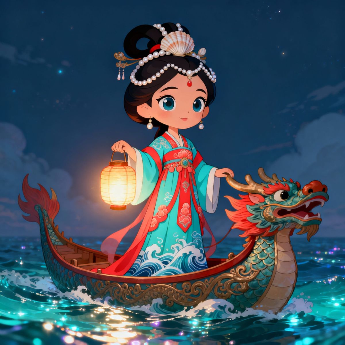 This 2D cartoon illustration features the Chinese sea goddess Mazu in a classic Disney animation style. She wears a detailed hanfu and stands on a dragon boat, holding a glowing lantern.