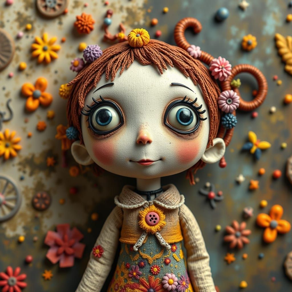 This image features a colorful, whimsical sack doll with a stitched smile and button eyes, set against a soft, dreamy background with subtle texture and warm, golden lighting, reminiscent of Tim Burton's fantastical worlds and textile artist Donna Wilson's intricate stitching and embroidery details.