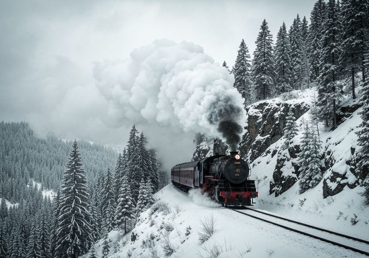 This image shows a vintage steam train in a detailed, realistic cinematic style, traveling through a snow-covered mountainous region on a cloudy day, emitting a large plume of smoke.
