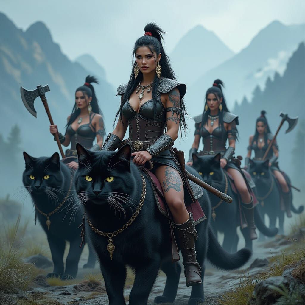 This image shows warrior women with tattoos riding black cats through misty mountains. They are armed with axes, preparing to battle snow leopards in a dark fantasy style.
