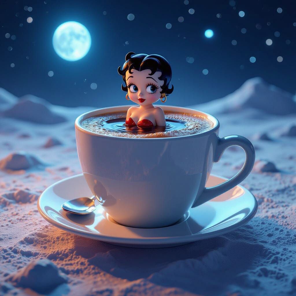 This image shows a hyperrealistic cup of coffee at the edge of a lunar void, illuminated by blue altitude lights, with a retro character. Features intricate detail and complementary colors, resembling fantasy concept art.