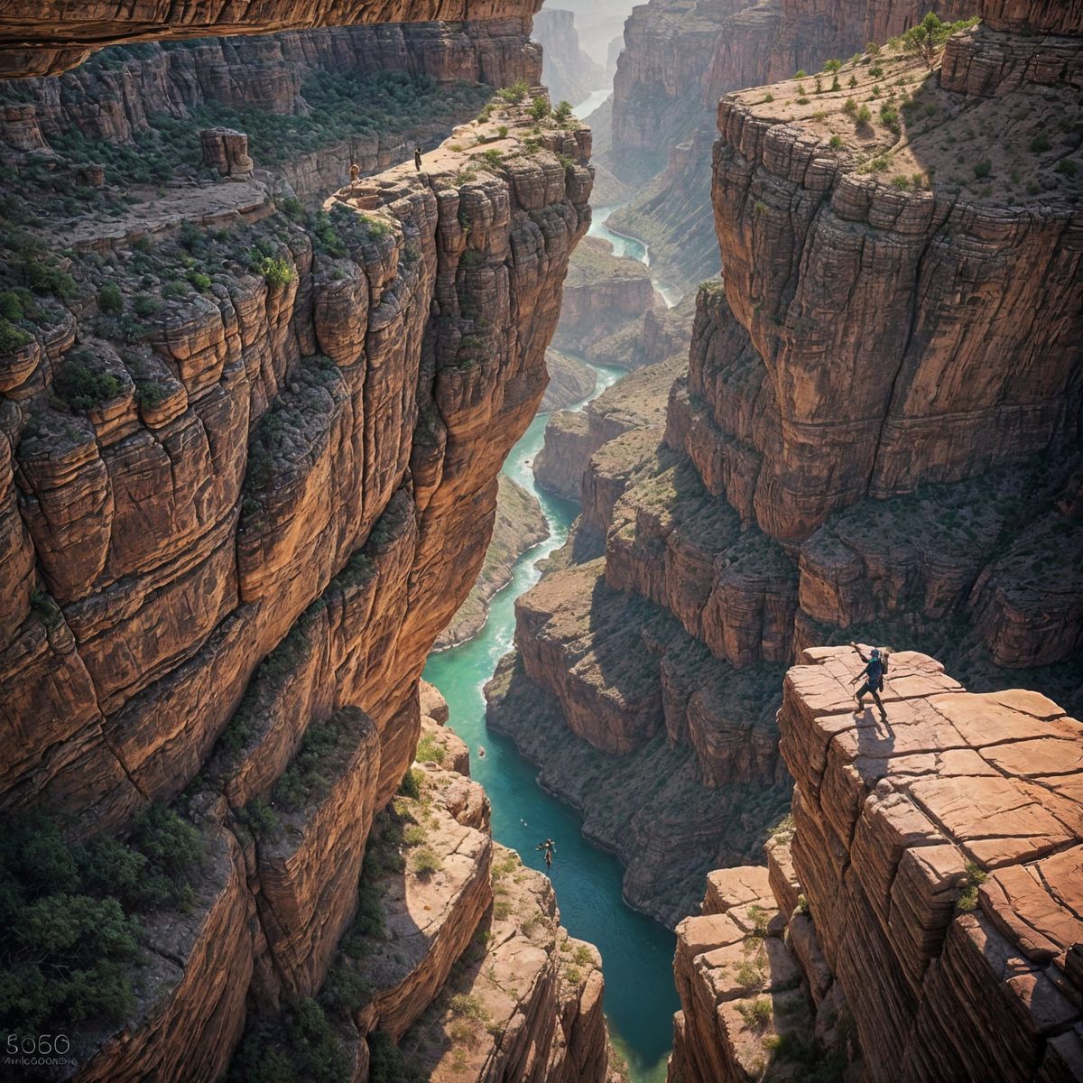 This image shows an adventurer swinging across a shadowy canyon towards ancient ruins. The digital art features cinematic lighting, intricate details, and vivid colors to create a hyperrealistic and dramatic scene.