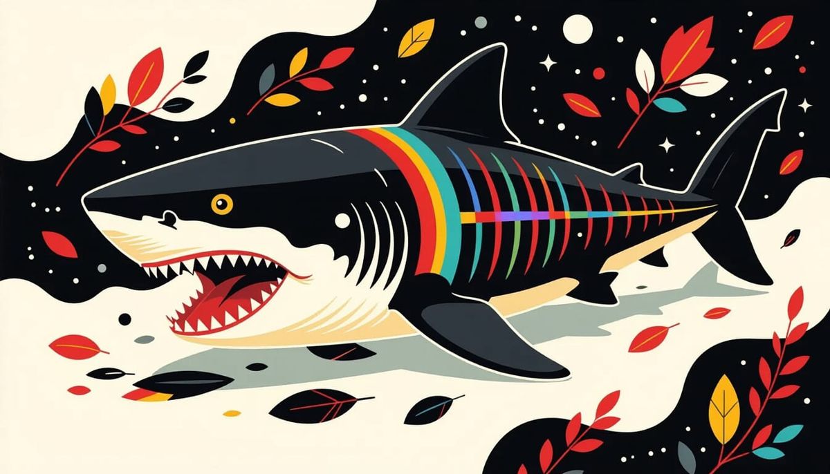 Create a detailed and abstract image featuring a dark, black stone-like background. Incorporate colors such as bold red, soft cream, and the muted metallic hue of pewter into the design. Sprinkle the scene with delicate patterns of leaf foil, An otherworldly alien black shark-creature with a sleek, ridged ...