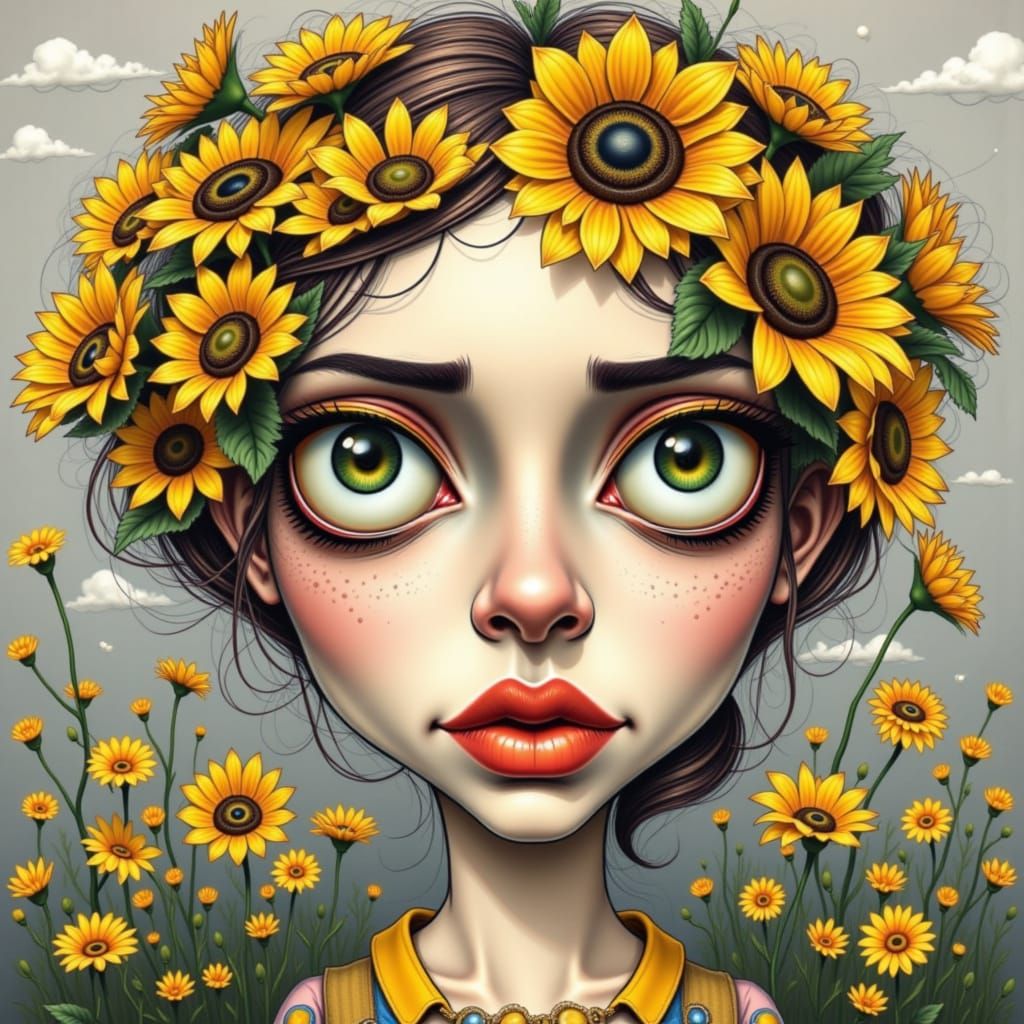 This image shows a whimsical bee woman surrounded by flowers. The artwork features a caricature style, giving the subject a playful and exaggerated appearance.