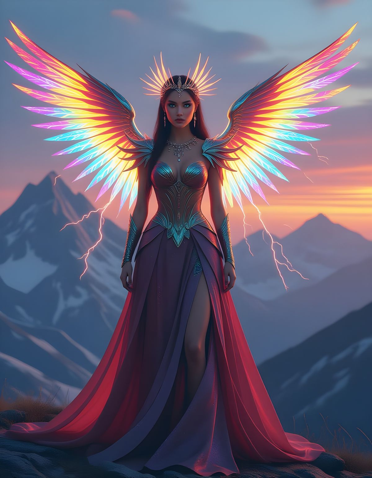A striking picture of a Slavic woman with plasma lightning wings standing on a mountaintop. She is adorned with fiery plasma clothing and anti-matter tiaras, rendered with ultra-realistic HDR effects.