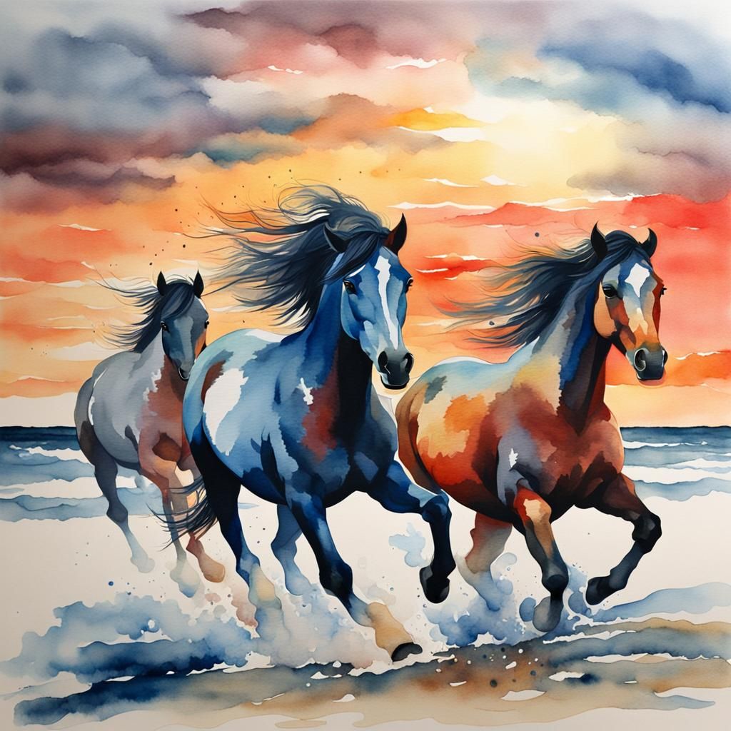 This image shows wild horses running on a beach at sunset. The scene is rendered as a watercolor painting with abstract elements and complementary colors.