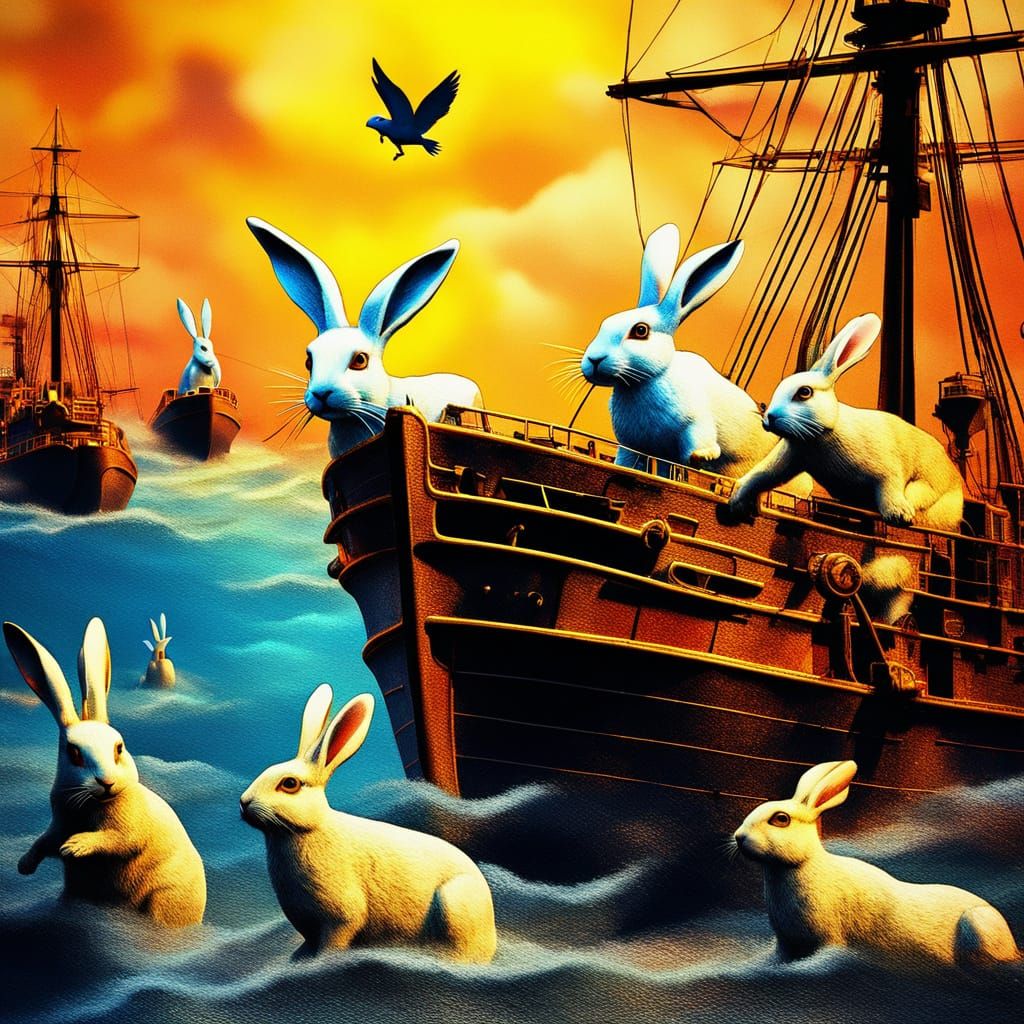 A vibrant pop art image of rabbits watching ships. Rendered as 3D digital art with soft focus and warm lighting, creating a dreamlike, surreal, and mystical scene.