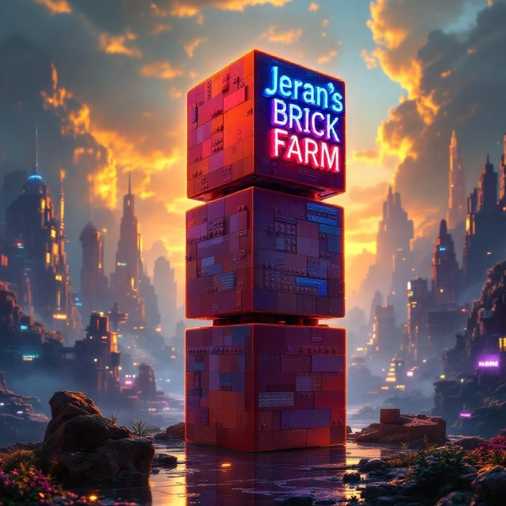 This image shows a tower of three Lego bricks with raised lettering spelling 'Jeran's Brick Farm'. The backdrop features a futuristic landscape with neon lighting and intricate details in a maximalist digital painting style.
