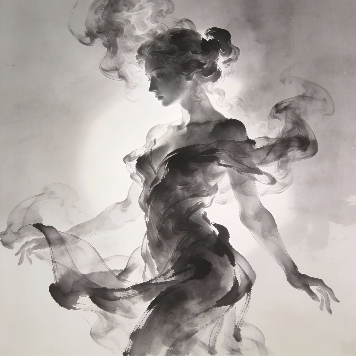 This image features a striking portrait sculpture of a woman made from swirling smoke, evoking the fluidity of fabric and the elegance of ink washes. The composition is defined by clear, crisp lines and ambient backlighting.