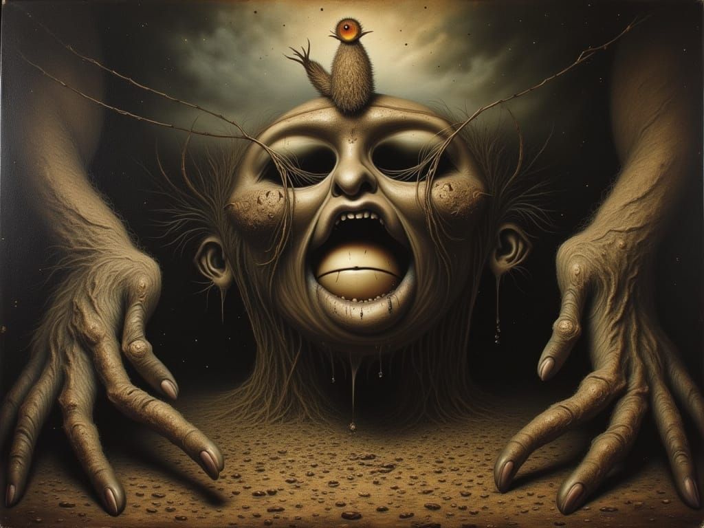 The smell of drinking mud in order to more clearly see the music dancing behind the eyes. Intensely surreal imagery and atmosphere, hypnagogia, clarity within distortion, liminal, cosmic, a mixture of 20th century Surrealist influences, chiaroscuro lighting, rich textures, oil on canvas. <lora:STRANGE ...