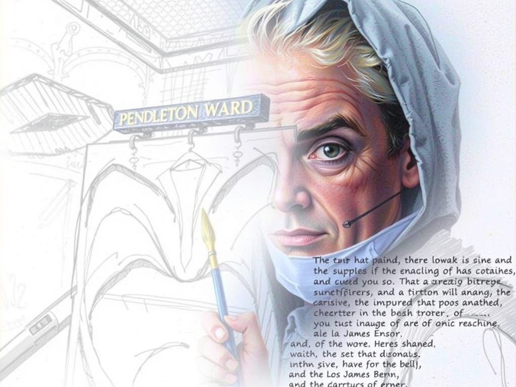 This image depicts a master artist at work, surrounded by the vibrant colors and textures of a half-finished self-portrait, with a dynamic, hyperrealistic style reminiscent of whimsical illustration and graphic storytelling.
