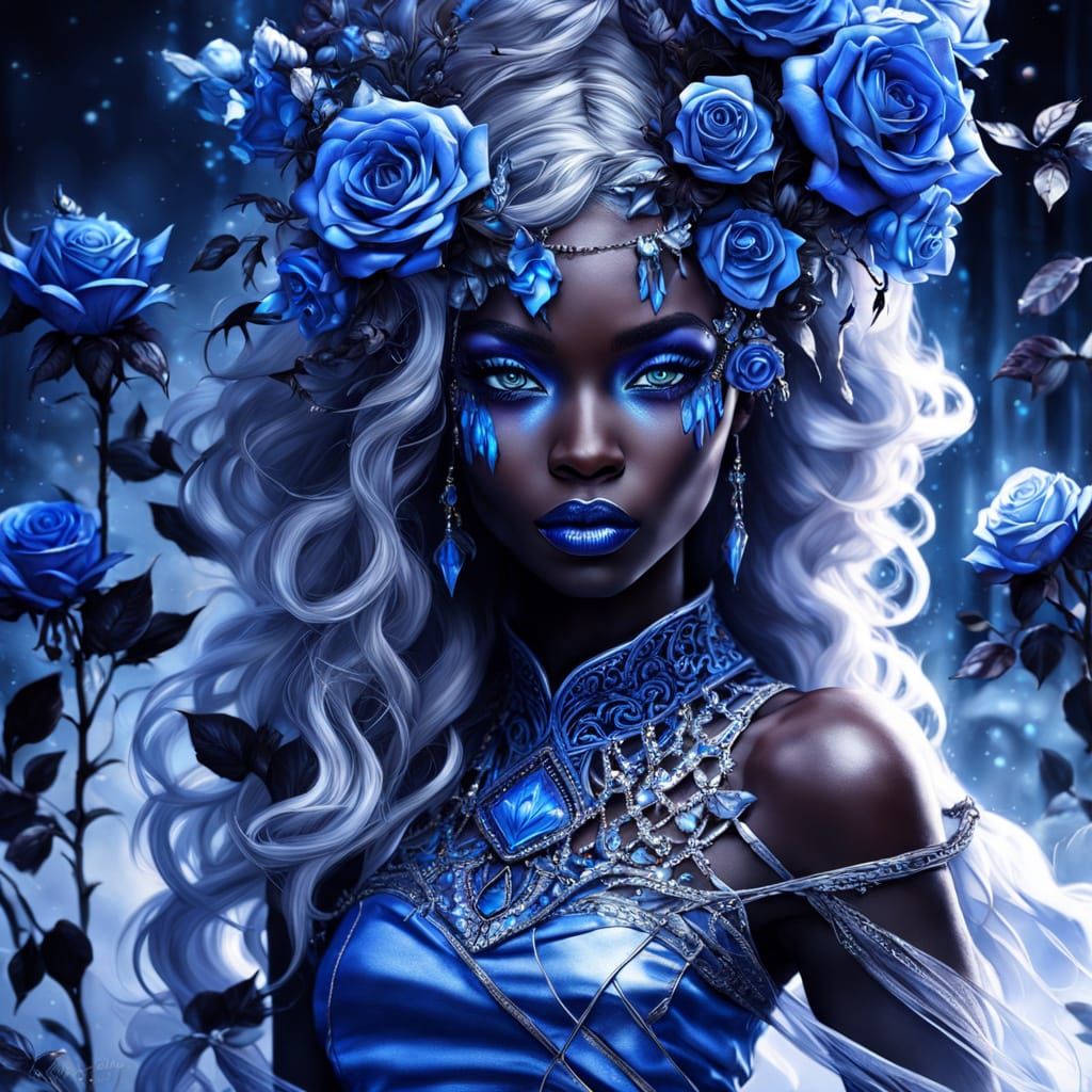 A dramatic portrait of a vampiric fae with striking features, glowing ice blue eyes, and an exotic complexion, set against a dark backdrop of black roses and smoke.