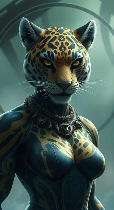 This image shows a medium shot of Kipo, a jaguar/human hybrid, set against a lush forest backdrop. The vibrant digital art features triadic colors and warm, golden lighting, reminiscent of 3D animation.